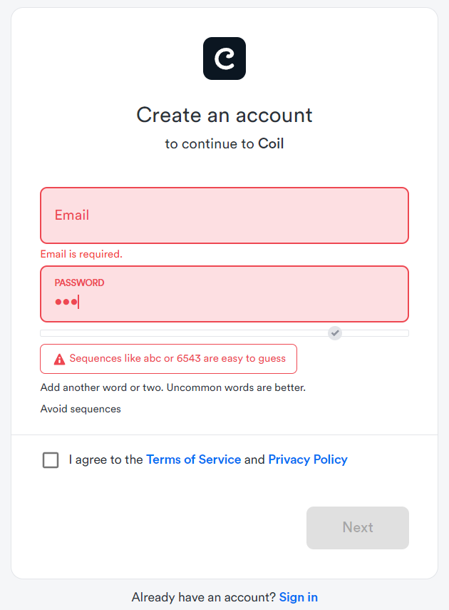 Coil dumb password rule screenshot
