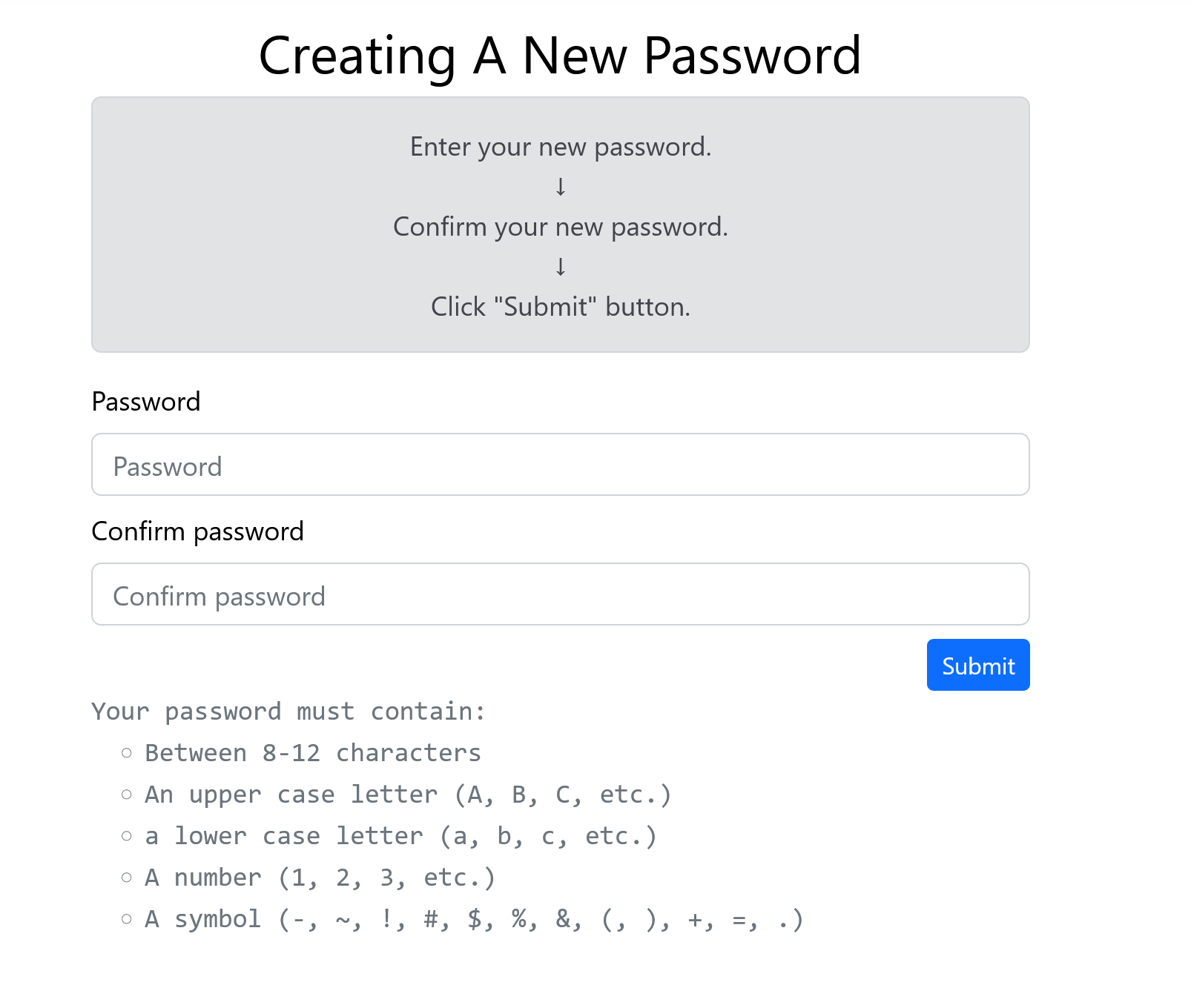 Your password must contain: Between 8-12 characters An upper case letter (A, B, C, etc.) a lower case letter (a, b, c, etc.) A number (1, 2, 3, etc.) A symbol (-, ~, !, #, $, %, &, (, ), +, =, .)