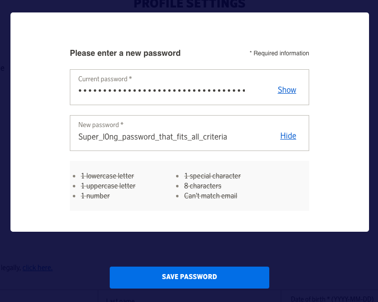 The password rules itself is fine, but, it doesn't inform about the max length of the password. Their max length is 14 characters, so even if you enter a password of 42 chars, you can login with the first 14 of it. In this case, I changed my password to Super_l0ng_password_that_fits_all_criteria, and could login with Super_l0ng_pas
