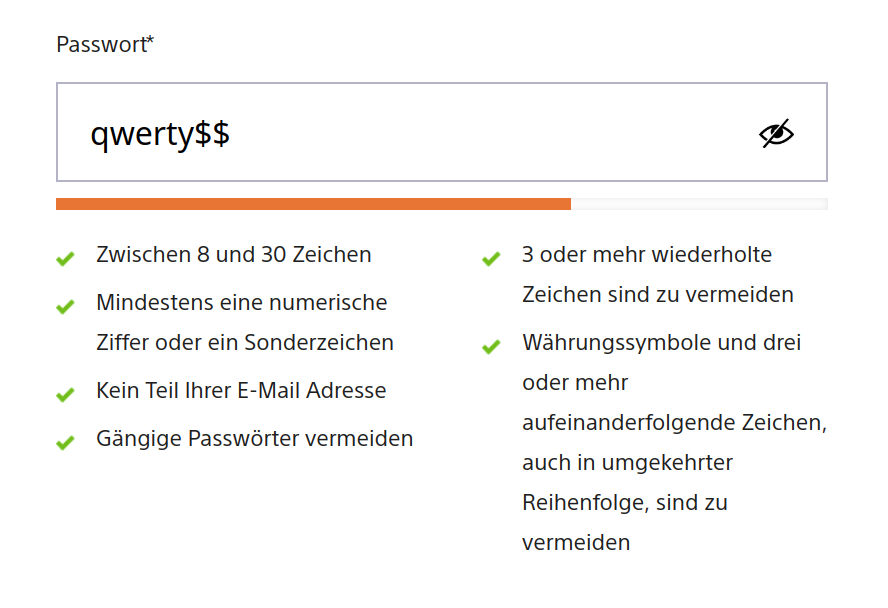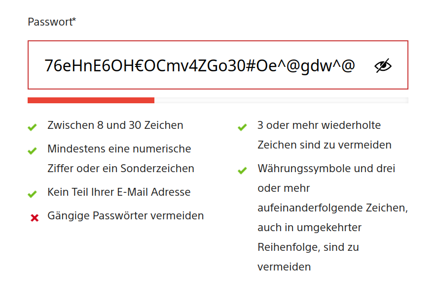 - currency characters and 3 or more consecutive characters, also in reverse order, should be avoided Somehow "$" is not counted as a currency character, but as a special character. Moreover, as soon as the password contains "€", "£" or "元" for example, it is regonized as a common password. Hence "76eHnE6OH€OCmv4ZGo30#Oe^@gdw^@" does not fulfill the requirements while "qwerty$$" does.