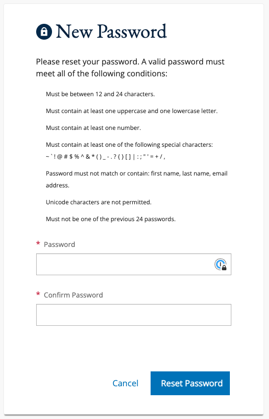 • Must contain at least one of the following special characters: ~ ` ! @ # $ % ^ & * ( ) _ - . ? { } [ ] | : ; " ' = + / ,