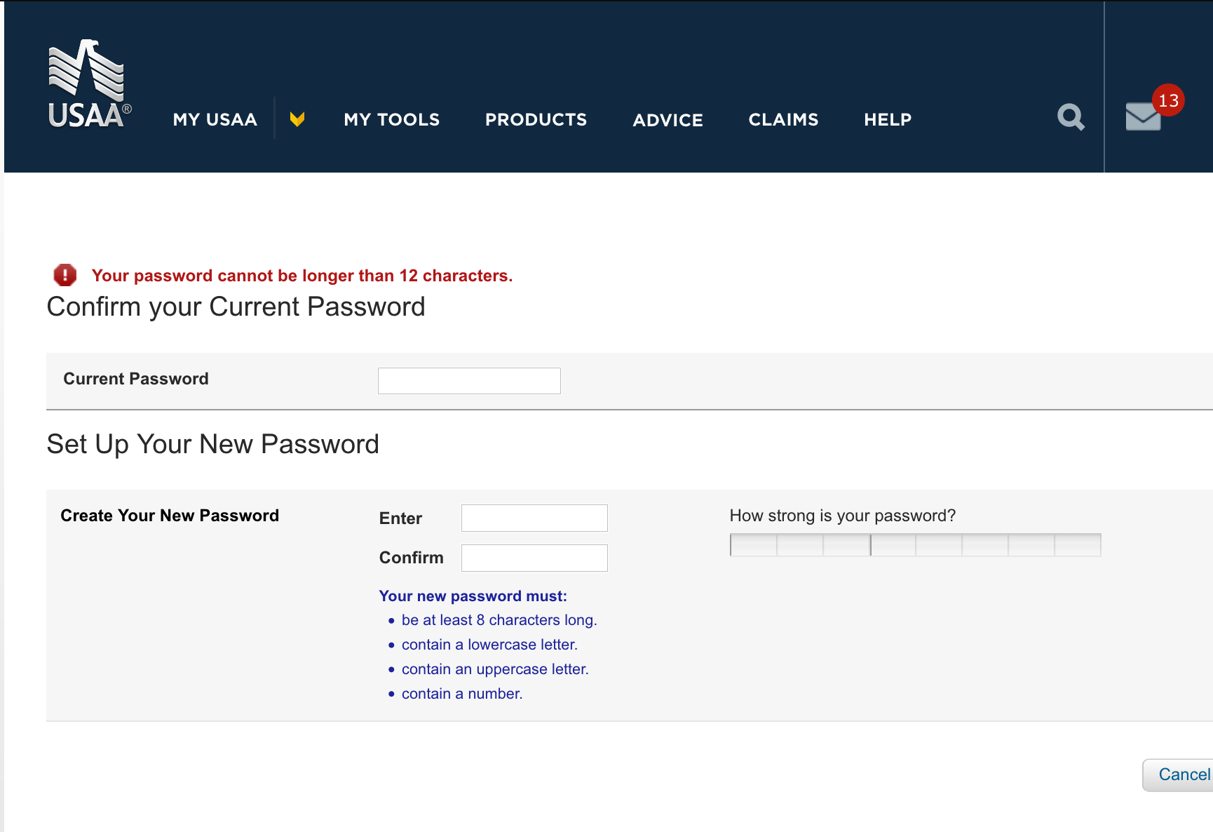 Password cannot be longer than 12 characters but they don't tell you that until after you try a new password. To make up for this fact they've added dubious additional security features on top of this weak foundation.