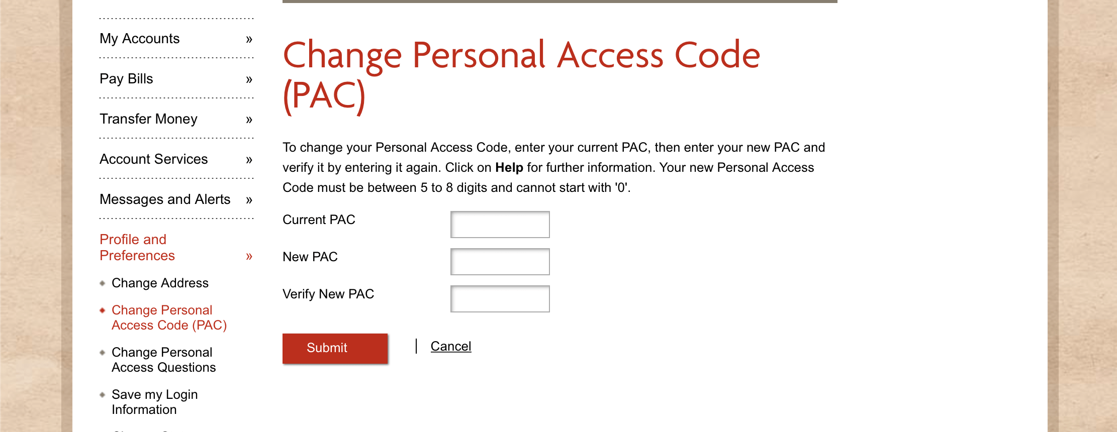 Personal Access Code (or PAC–they are too ashamed to call it a password), must be between 5 to 8 digits and cannot start with '0'. (no letters or symbols)