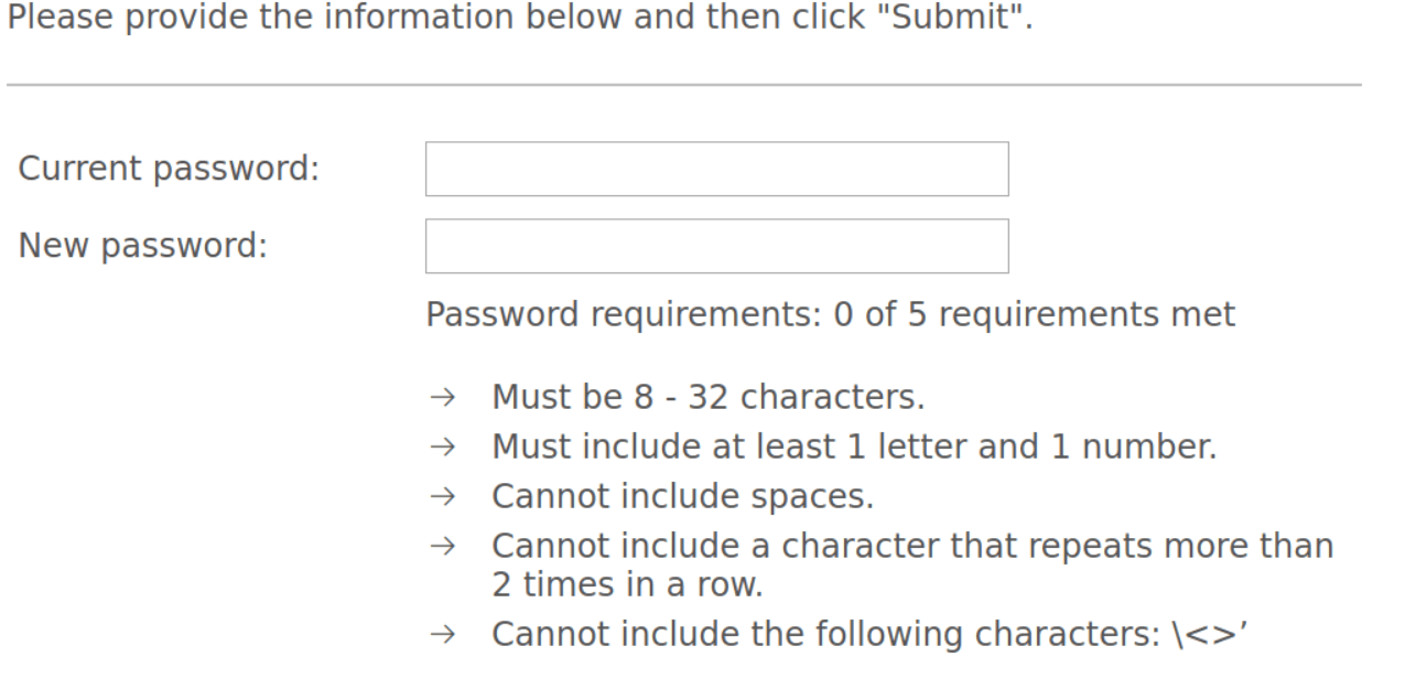 The password requirement is not even fully enumerated. Upon inspection of the source code, the following lines were found, hidden by javascript: "Must include at least %MINSPECIAL of the following characters:-.~!@#&_{}|:$%^*()=[];?/+"